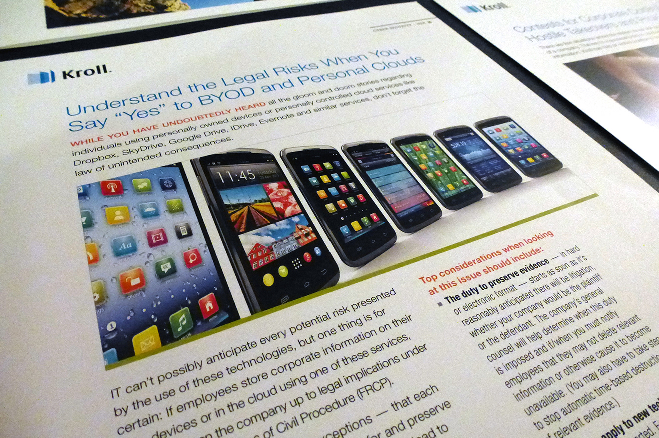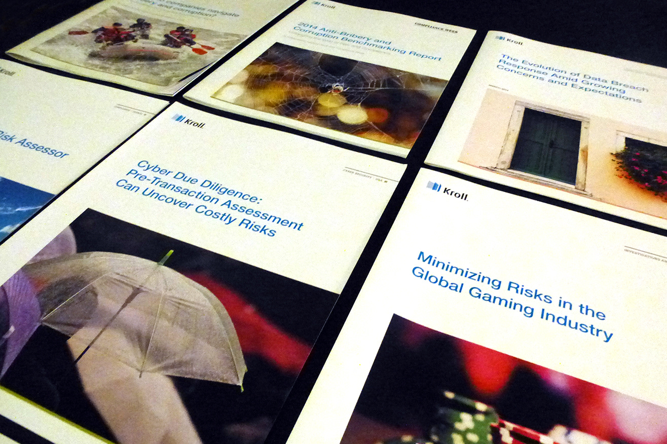 Rebranded Kroll's design language and establish new global print guidelines for all marketing collateral including print publications, business card, entire stationary suite, event displays, presentations and merchandise for three business practices and were used across 50 offices in more than 30 countries.